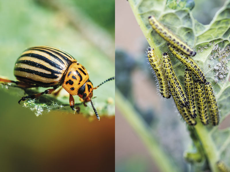 Radici, foglie, fiori e frutti vengono danneggiati dagli insetti masticatori (come coleotteri e bruchi) e da quelli pungitori-succhiatori (afidi, acari, cimici, cocciniglie). Per una protezione ottimale è necessario usare prodotti che agiscano come barriera meccanica (Propolis, Caolino, Geotamnio, Bicarbonato di Sodio e Silicato di Potassio), come detergente (Sapone Molle e Olio di Lino,) e/o per contatto o ingestione (Greenim, Olio di Neem, Propolis, estratti vegetali di Aglio, Assenzio, Ortica e Suriname).
